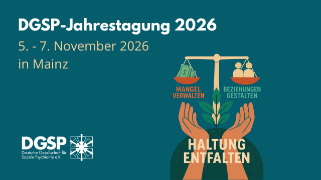 Deutsche Gesellschaft für Soziale Psychiatrie e.V. (DGSP)Als unabhängiger Fachverband für Sozialpsychiatrie setzt sich die DGSP für die Weiterentwicklung und Verbesserung menschenrechtsbasierter Hilfsangebote für Menschen mit psychischen Beeinträchtigungen ein.