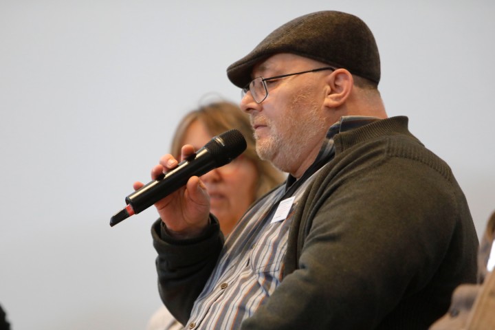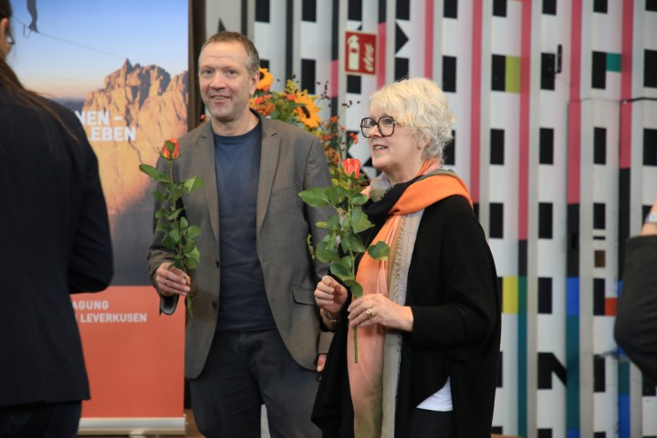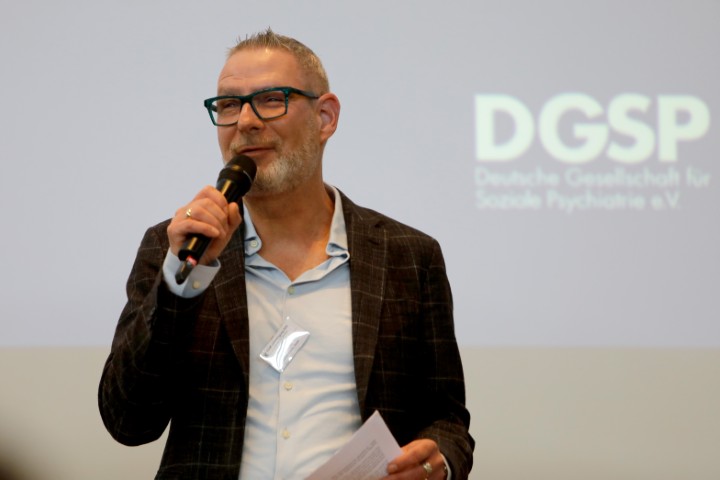 Offizielle Tagungseröffnung. Nach den Begrüßungsworten des DGSP-Vorstands (Stefan Corda-Zitzen) und des Leverkusener Oberbürgermeisters, übernahm Christian Reumschüssel-Wienert kurzfristig den ersten Vortrag. Er hielt eine unterhaltsame Stegreifrede über psychiatriehistorische Aspekte und empfahl der DGSP die Berücksichtigung des Recovery-Konzepts. Daraufhin befasste sich eine trialogisch besetzte Runde mit der Frage, inwieweit das Tagungsmotto die tatsächliche Lebenswirklichkeit der Betroffenen widerspiegelt.